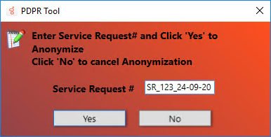 In the case of a Single Request, you must enter a service request number and click Yes to anonymize the selected data. Click No on the Enter Service Request dialog to cancel the anonymize operation.