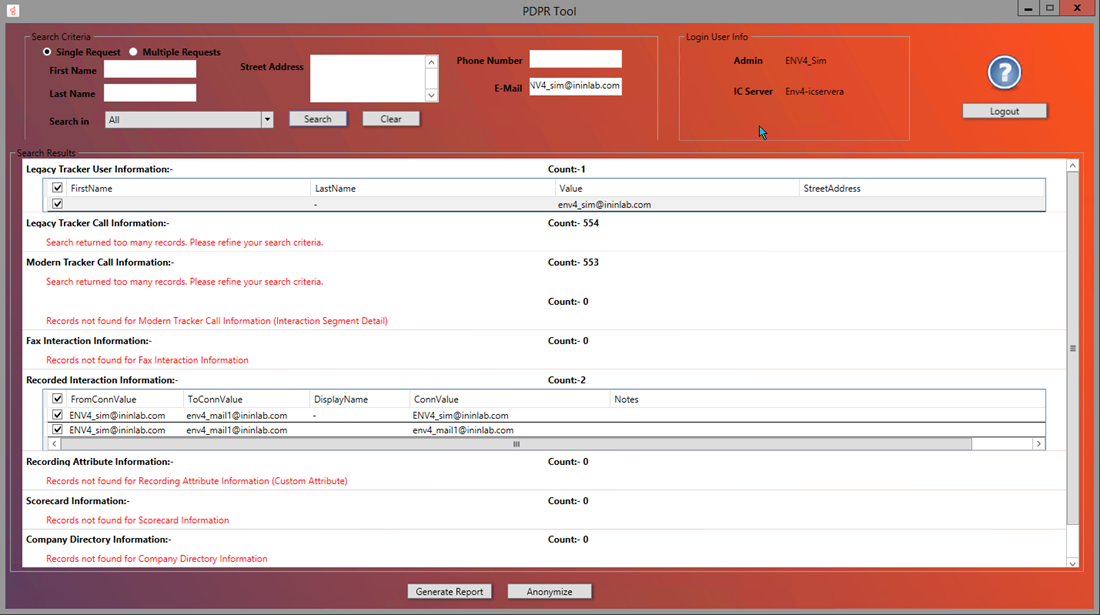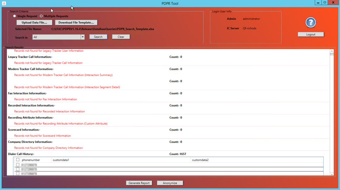 To use the PureConnect Data Privacy Request tool to anonymize PII data in the PureConnect database: