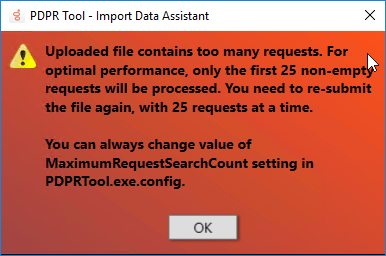 Note: Version 2.2.0 introduced a variable "TrackerEnabled" in the PDPRTool.exe.config file, which is set to "true" in the default case that all user data is included in the database. You can set "TrackerEnabled" to "false" when tables do not include user information such as First Name, Last Name and Address. If "TrackerEnabled" is set to "false", be sure to include email and phone number data in the search criteria, for better performance.
