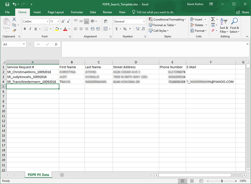 Open the PDPR_Search_Template.xls file and add the PII data for multiple requests - one request per row. Note the following guidelines.
