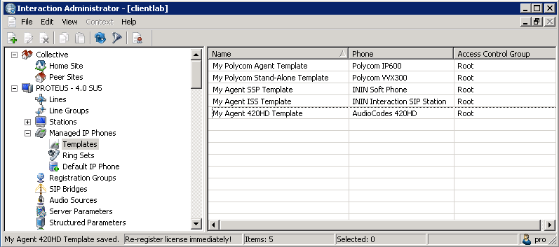 The Managed IP Phones container in Interaction Administrator holds all Polycom phones, Interaction SIP Station phones, SIP Soft Phones, AudioCodes, and Genesys phones managed by the CIC provisioning subsystem. The Managed IP Phones container also contains templates to create new managed IP phones and the SIP stations associated with each, as well as registration groups for organizing phones according to the sources of registration data.