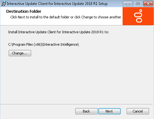 In the Destination Folder screen, select the default directory to install Interactive Update Client or select Change to choose a different directory.