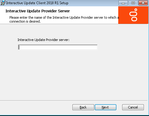 In the Interactive Update Provider Server screen, type the name of the Interactive Update Provider server (host CIC server) and click Next.