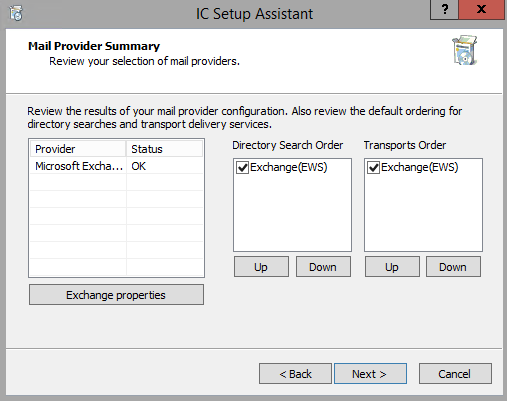 Select the Exchange properties button to access the Exchange Configuration screen to configure Exchange Web Services (EWS). EWS is initially enabled by default. Disable Exchange MAPI because it is no longer supported.