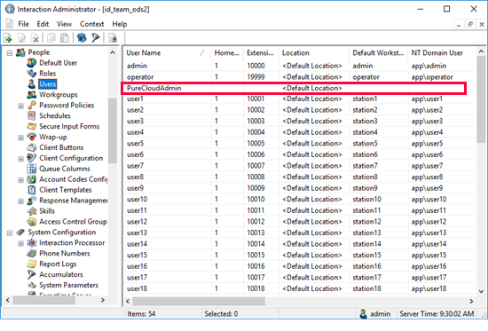 Important! The CIC system employs the PureCloudAdmin user for the connection to Genesys Cloud and the associated Genesys Cloud Bridge connectors. The Genesys Cloud Bridge connectors use the PureCloudAdmin user credentials to establish the connection to the CIC server. Do not modify or delete the PureCloudAdmin user.