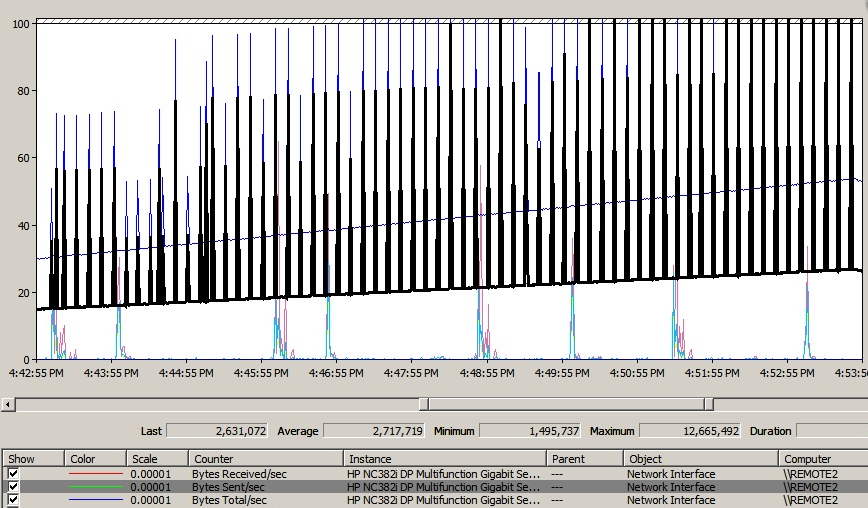 When an Interaction Media Server records calls, it temporarily stores recordings locally before moving them to an Interaction Recorder Remote Content Service (RCS) system or Interaction Recorder. The following image displays how jitter was introduced when Interaction Media Server transmits compressed RTP recordings. In lab tests, the network layer starts to fail when RTP approaches the 120 Mbps level. Dedicated NICs do not help to alleviate this problem on Hyper-V hosts.