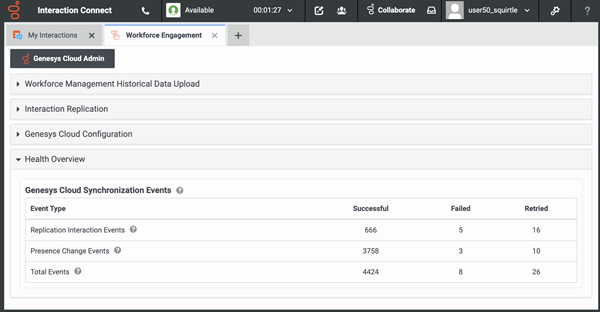 Administrators can use the Health Overview section of the Workforce Engagement view in Interaction Connect to monitor the "health" and status of the Genesys Cloud for PureConnect integration.