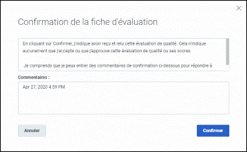 Remarque : le bouton Confirmer la carte de performance n'apparaît pas si aucune confirmation n'est requise. Si vous avez déjà confirmé cette fiche d'évaluation, vous pouvez cliquer sur Afficher la confirmation pour examiner les commentaires que vous avez pu faire lorsque vous avez confirmé cette fiche d'évaluation.