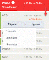 Cliquez sur l'icône Informations sur les activités. Cliquez sur l'icône d'horloge de l'activité, puis ignorez l'alerte ou définissez un intervalle de répétition.