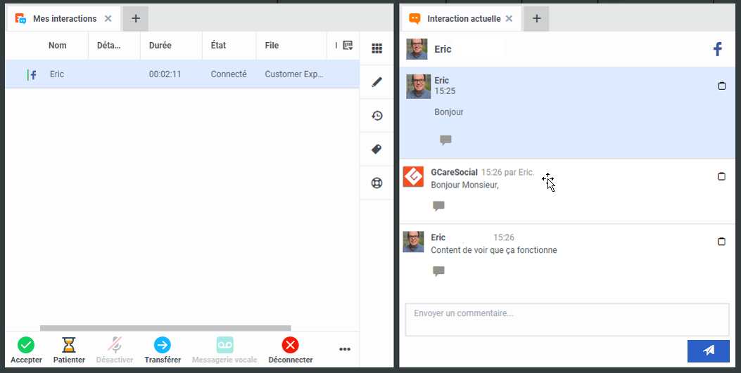 L'interaction sélectionnée apparaît dans la vue Interaction actuelle comme un échange via des messages directs de médias sociaux. |