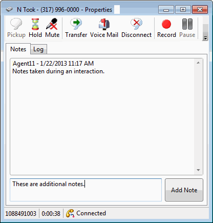 Vous pouvez accéder à la boîte de dialogue Propriétés de l'interaction pendant ou juste après une interaction, c'est-à-dire avant qu'elle ne soit supprimée de Mes interactions ou de toute autre file d'utilisateur. Vous pouvez ajouter des notes ou afficher le journal de l'interaction. Si vous prenez des notes dans une interaction dans la file d'un autre utilisateur, seul cet autre utilisateur peut les afficher. De même, si votre entreprise utilise ces codes et que vous êtes autorisé à utiliser ces fonctions, vous pouvez attribuer des codes de compte ou des codes de conclusion. Pour plus d'informations, consultez la rubrique Codes de compte et de conclusion.