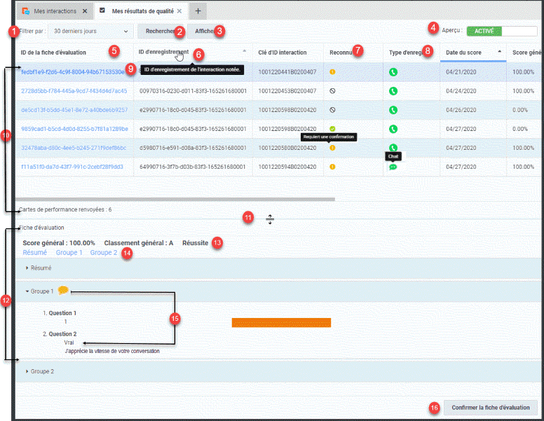 La vue Mes résultats de qualité permet d'accéder, en toute sécurité, aux fiches d'évaluation et aux enregistrements associés de vos interactions. La vue Mes résultats de qualité peut afficher une liste de fiches d'évaluation ou une fiche d'évaluation particulière. Au besoin, vous pouvez confirmer que vous avez examiné ces fiches d'évaluation.
