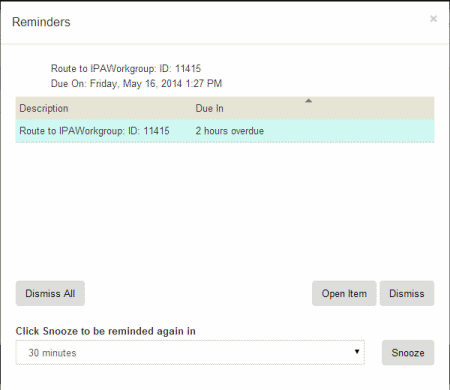 - To pick up the associated work item and open it in the Work Item Viewer, select a reminder and click Open Item.
