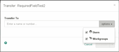 Tip: The Options drop-down list limits your search for a transfer recipient to either users or workgroups or both. You cannot transfer a work item to a phone, station, station group, or attendant profile, so these search criteria do not appear.