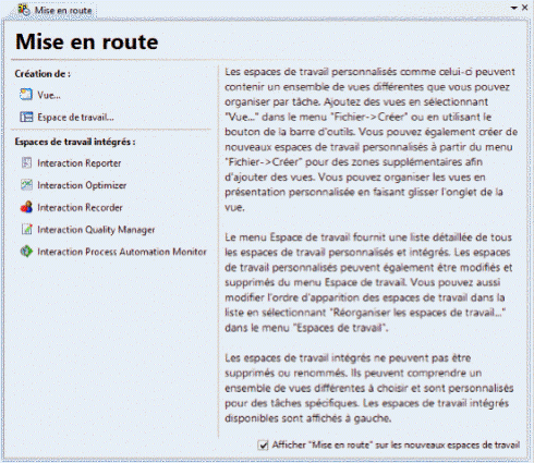 Remarque : Pour supprimer de manière définitive la vue Mise en route de tous les espaces de travail personnalisés que vous créerez à l’avenir, désélectionnez la case Afficher Mise en route sur les nouveaux espaces de travail. Si vous désélectionnez cette case, IC Business Manager crée des espaces de travail personnalisés sans vue. Pour des informations sur la création de vues, reportez-vous à la rubrique Ajout d’une nouvelle vue à l’espace de travail.