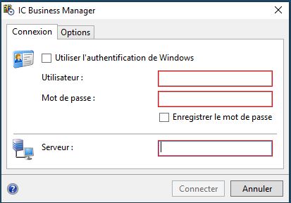 Cette section décrit les paramètres disponibles sur la boîte de dialogue Connexion d’IC Business Manager.