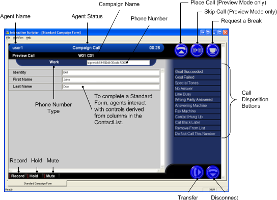 Interaction Scripter .NET Client populates the agent's display with information pertaining to the call, the customer, and the campaign, based on behavior defined in a script. Information collected or modified by agents is routed back to campaign database tables.