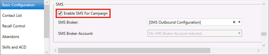Use the options in the SMS frame to enable or disable the sending of SMS messages and to select both an SMS broker and an SMS broker account.
