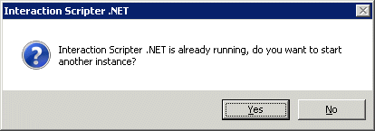 Starting multiple instances of Interaction Scripter .NET Client is not recommended. If you see this dialog, click No to use the currently running instance of the program. You may need to make Scripter's window active by clicking on the task bar. -