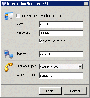 Interaction Scripter may present a login dialog at startup, so that it can establish a connection with your CIC server. Login with your CIC user name and password. If you check Save Password, the client will remember your password the next time you log in.
