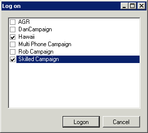 If the Login Campaign security right is assigned to you, the Log on dialog appears, so that you can place a checkmark next to campaigns that you wish to accept calls from.