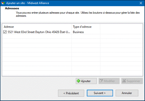 Résultat : la page Adresses de l'assistant Ajouter un site apparaît.