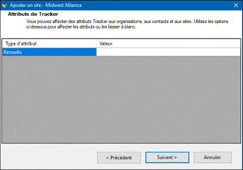 Dans la page Attributs Tracker, entrez les valeurs de tous les types d'attribut affichés et cliquez sur Suivant >.