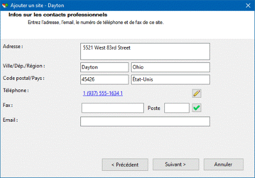 Astuce : vous pouvez entrer le nom d'un département ou d'une région dans la zone de texte Département/Région ou le nom d'un pays dans la zone de texte Pays. Cliquez sur la commande Numéro de téléphone pour valider et mettre en forme le numéro de téléphone.