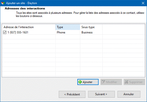 Sélectionnez une adresse dans la liste et cliquez sur Modifier pour modifier les informations relatives à l'adresse d'interaction.