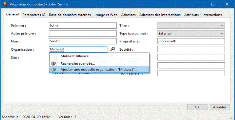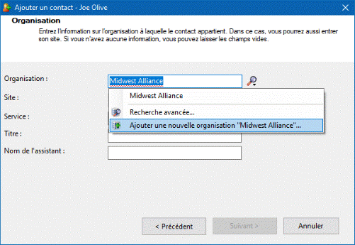 Recherchez un contact Tracker. Dans la page Résultats de la recherche de l'assistant Rechercher un contact, cliquez avec le bouton droit sur le nom d'un contact, puis sélectionnez Propriétés. Dans la boîte de dialogue Propriétés du contact, dans la zone de texte Organisation, entrez la totalité ou une partie du nom de l'organisation, puis cliquez sur la commande Rechercher. Cliquez sur Ajouter une nouvelle organisation.