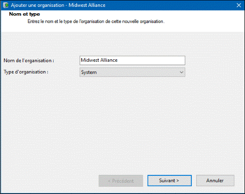 Entrez le nom de l'organisation. Avertissement : chaque nom d'organisation doit être unique. |