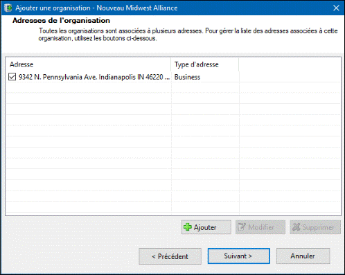 Résultat : la page Adresses de l'organisation de l'assistant Ajouter une organisation apparaît. L'adresse que vous venez d'ajouter apparaît dans la liste.