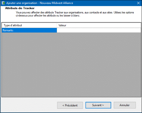 Résultat : la page Attributs Tracker de l'assistant Ajouter une organisation apparaît.