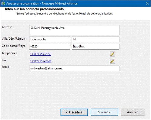 Astuce : vous pouvez entrer le nom d'un département ou d'une région dans la zone de texte Département/Région ou le nom d'un pays dans la zone de texte Pays. Cliquez sur la commande Numéro de téléphone pour valider et mettre en forme le numéro de téléphone.