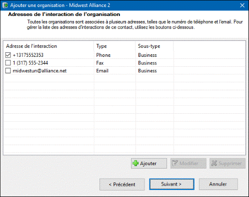 Sélectionnez une adresse dans la liste et cliquez sur Supprimer pour supprimer l'adresse d'interaction de cette organisation.