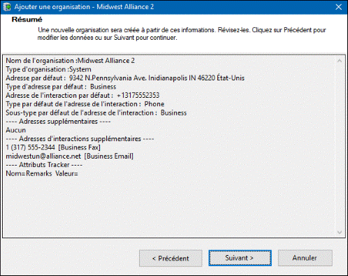 Vérifiez les entrées et cliquez sur Suivant > pour sauvegarder ces informations d'organisation.