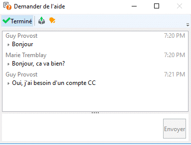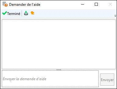 Lorsque vous cliquez sur le bouton Assistance dans Mes interactions ou dans la fenêtre Chat, la boîte de dialogue Demander de l'aide apparaît. Vous entrez la description du problème et cliquez sur Envoyer.