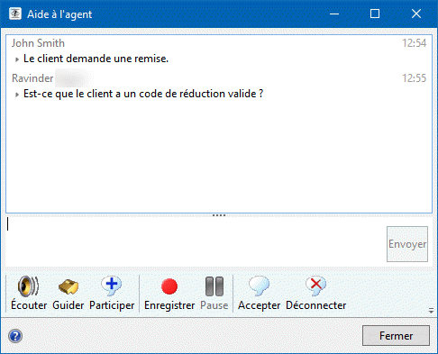 Répondre ouvre la boîte de dialogue Répondre aux demandes d'aide pour fournir des commentaires et une assistance immédiate à l'utilisateur. Le superviseur peut discuter par sms avec l'agent et utiliser les contrôles des appels pour écouter, guider, participer, enregistrer, mettre en pause, répondre ou déconnecter l'appel.