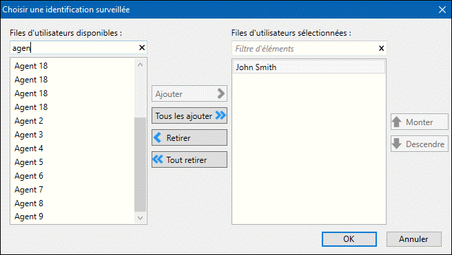 Lorsque la liste des files d'utilisateurs sélectionnées contient les noms des files d'utilisateurs que vous souhaitez surveiller, cliquez sur OK.