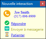 Une alerte d'interaction apparaît lorsque vous recevez une nouvelle interaction d'alerte. La boîte de dialogue Alerte d'interaction affiche des informations sur l'interaction, par ex. le nom, le numéro et une icône correspondant au type d'interaction. Cliquez sur Répondre pour répondre à l'interaction ou cliquez sur Envoyer à la messagerie vocale pour envoyer l'interaction vers votre messagerie vocale. |