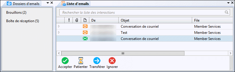 La liste des emails affiche les emails du dossier d'emails actuellement sélectionné. Si vous ne sélectionnez aucun dossier ou n'affichez pas la vue Dossiers des emails, la liste des emails affiche tous les messages de votre file d'attente (Mes interactions).
