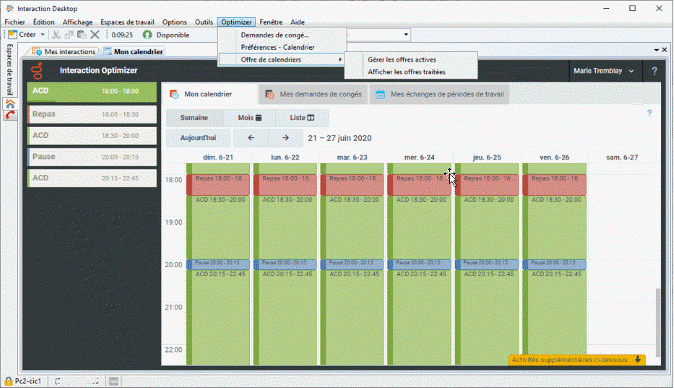 Remarque : l'échange de périodes de travail est accessible à partir du client CIC uniquement dans l'application de navigateur Interaction Optimizer intégrée.