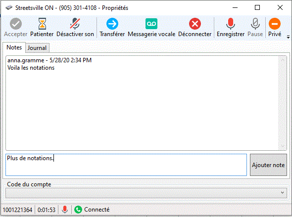 Vous pouvez accéder à la boîte de dialogue Propriétés de l'interaction pendant ou juste après une interaction, c'est-à-dire avant qu'elle ne soit supprimée de Mes interactions ou de toute autre file d'utilisateur. Vous pouvez ajouter des notes ou afficher le journal de l'interaction. Si vous prenez des notes dans une interaction dans la file d'un autre utilisateur, seul cet autre utilisateur peut les afficher. De même, si votre entreprise utilise ces codes et que vous êtes autorisé à utiliser ces fonctions, vous pouvez attribuer des codes de compte ou des codes de conclusion. Pour plus d'informations, consultez la rubrique Codes de compte et de conclusion.