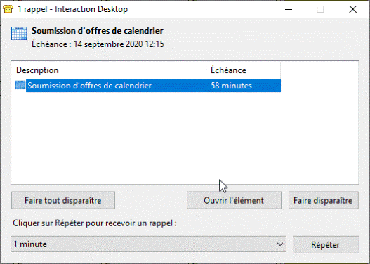 Éventuellement, un rappel apparaît dans la boîte de dialogue Rappels des activités planifiées Optimizer lorsque la fenêtre d'offre est sur le point de fermer.