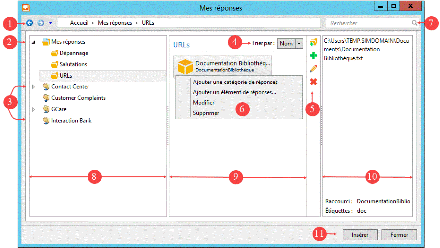 Pour créer, modifier, organiser et afficher des éléments et des catégories de réponses, utilisez la fenêtre Mes réponses. Elle contient un volet de navigation, une liste d'éléments et de catégories, ainsi qu'un volet d'aperçu.