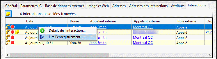 Cliquez avec le bouton droit sur l'interaction sélectionnée et sélectionnez Lire l'enregistrement dans le menu de raccourcis.