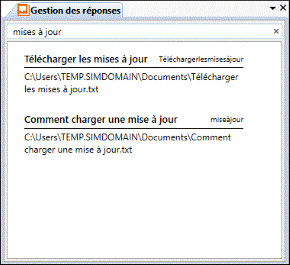 Vous pouvez utiliser la vue Gestion des réponses pour rechercher des réponses préenregistrées lors de toute interaction. Vous pouvez insérer ces réponses dans une réponse par chat, un email de réponse ou des notes d'interaction. Vous pouvez transmettre oralement les informations lors d'un appel.