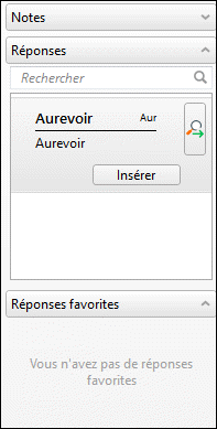 Les sections déroulantes Réponses et Réponses favorites apparaissent dans la barre latérale de la fenêtre Chat et de la fenêtre Email pour les messages sortants. La section Réponses est également disponible dans la fenêtre Rappel. Pour plus d'informations, consultez les rubriques Gestion des réponses pendant une session de chat ou Utilisation de la gestion des réponses dans un email.