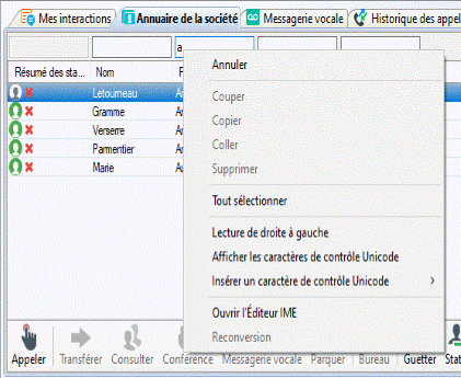 Le menu contextuel permet d'utiliser le presse-papiers Windows pour copier et coller du texte dans les champs de recherche. L'ordre de lecture de droite à gauche est disponible pour les langues qui s'écrivent de droite à gauche, comme l'hébreu ou l'arabe. Les options Afficher les caractères de contrôle Unicode, Afficher caractère de contrôle Unicode, IME ouvert et Reconversion sont disponibles pour les langues asiatiques. Windows propose ces options. Pour plus d'informations, consultez le site http://technet.microsoft.com/library/Dd361903.