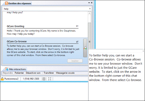 La recherche contextuelle est également disponible pour les éléments de réponse. Effacez tout le texte de la zone de texte Rechercher et la gestion des réponses recherche automatiquement les éléments de réponse basés sur le contenu de votre interaction par chat ou par email. Ce contenu est composé des cinq derniers mots entrés au cours du chat ou de l'email de réponse.